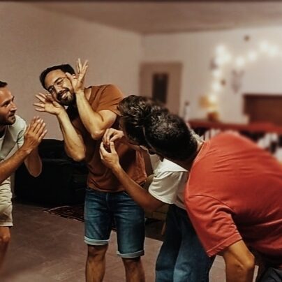 Qui coltiviamo il piacere del gioco, la capacità di lasciar andare il controllo e la disponibilità a sorprenderci con il gruppo e con chi ci guarda. L’improvvisazione non costruisce storie lunghe, ma si concentra sulla densità del momento presente.